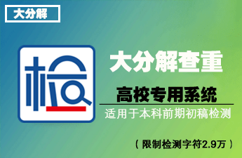 大分解查重系统:是用于查重本、专、硕、博士等毕业论文的查重系统,单篇最大可测2.9万字符,分解查重系统与VIP5.2,PMLC系统相比,查重范围小,因此查重结果会有差异,一般适用于初稿,中期修改检测使用。